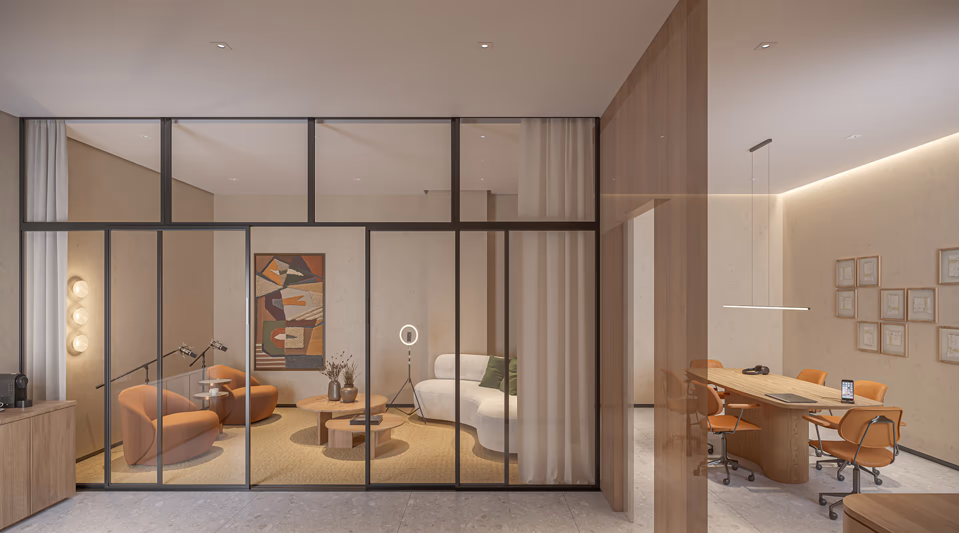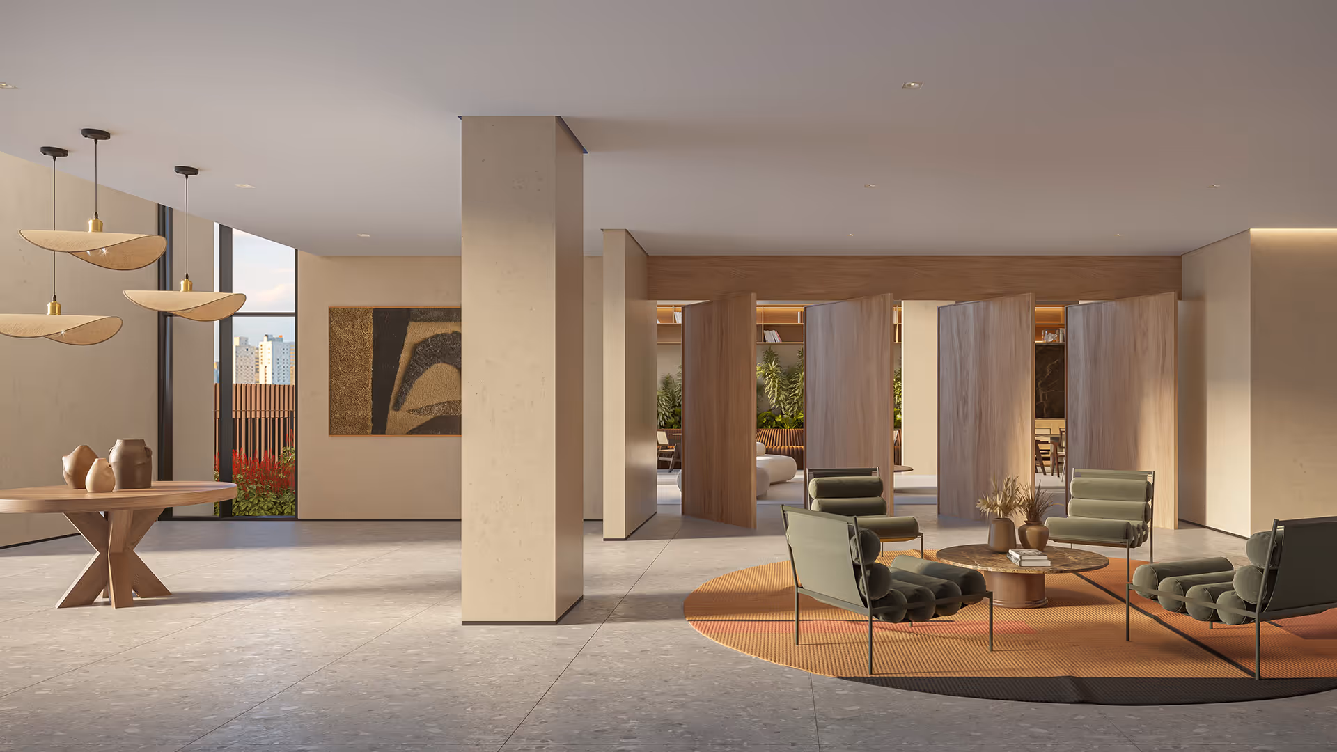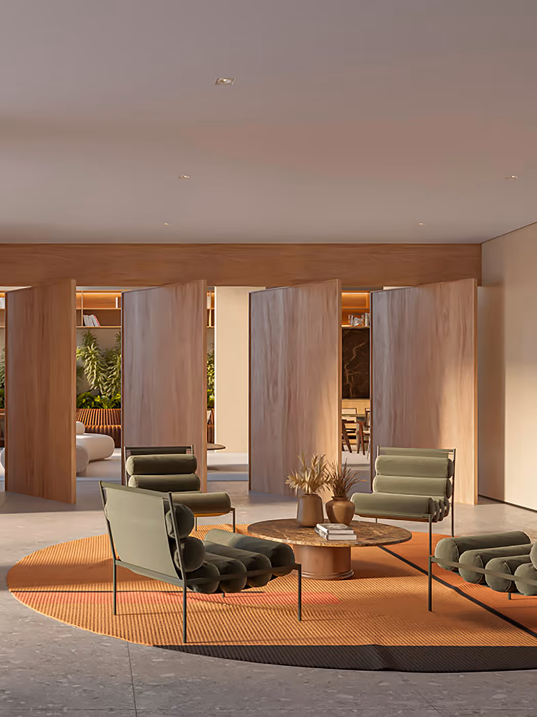 Os interiores do Alameda 45 unem funcionalidade e bem-estar, com spa, academia, estúdio de pilates, espaços de trabalho e conveniência. Em bases neutras e elegantes, o mobiliário e a arte trazem cor e personalidade. Ambientes híbridos, amplas aberturas e integração com o verde criam refúgios urbanos onde cada detalhe convida a relaxar e se sentir em casa.